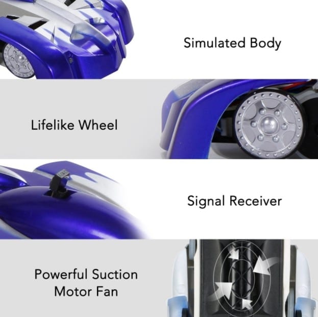 Using the latest in suction technology, the gravity defying car can drive on any smooth surface such as floors, walls, windows, glass and even ceilings!
